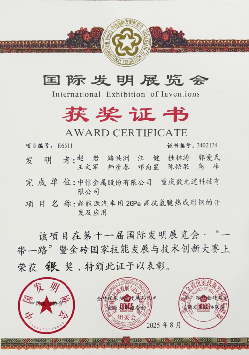 目前,该材料已完成岚图某车型一体式门环的试制与性能评价,并正在推进赛力斯汽车的材料认证流程。在知识产权与科研方面,已申请国家发明专利6项,其中1项已获授权,发表氢脆领域顶级SCI论文3篇,并于2025年荣获第十一届国际发明展览会银奖。HEROs2000具备广阔的应用前景,未来可拓展至一体式电池包壳体等车身大型集成件制造,为推动汽车轻量化、提升碰撞安全性提供稳定可靠的中国材料解决方案。