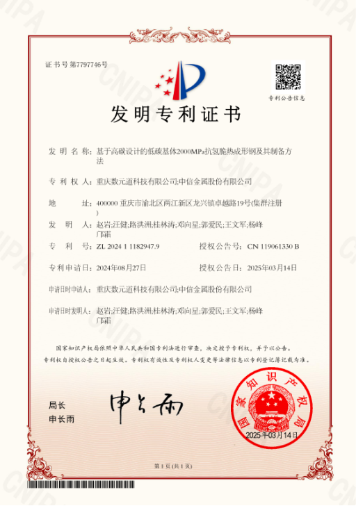 HEROs2000是一款2000 MPa级超高强度抗氢脆热成形钢,由重庆数元道科技有限公司联合中信金属股份有限公司及唐山钢铁集团共同研发制造,并于2024年10月在第二届微合金化高性能汽车钢技术研讨会(重庆)正式发布。在严苛的“1.1倍屈服强度+0.1 mol/L HCl溶液”环境下,该产品无开裂持续时间超过300小时,同时保持断后伸长率>6.0%,极限尖冷弯角达到55°,表现出优异的综合力学性能与抗氢脆能力。